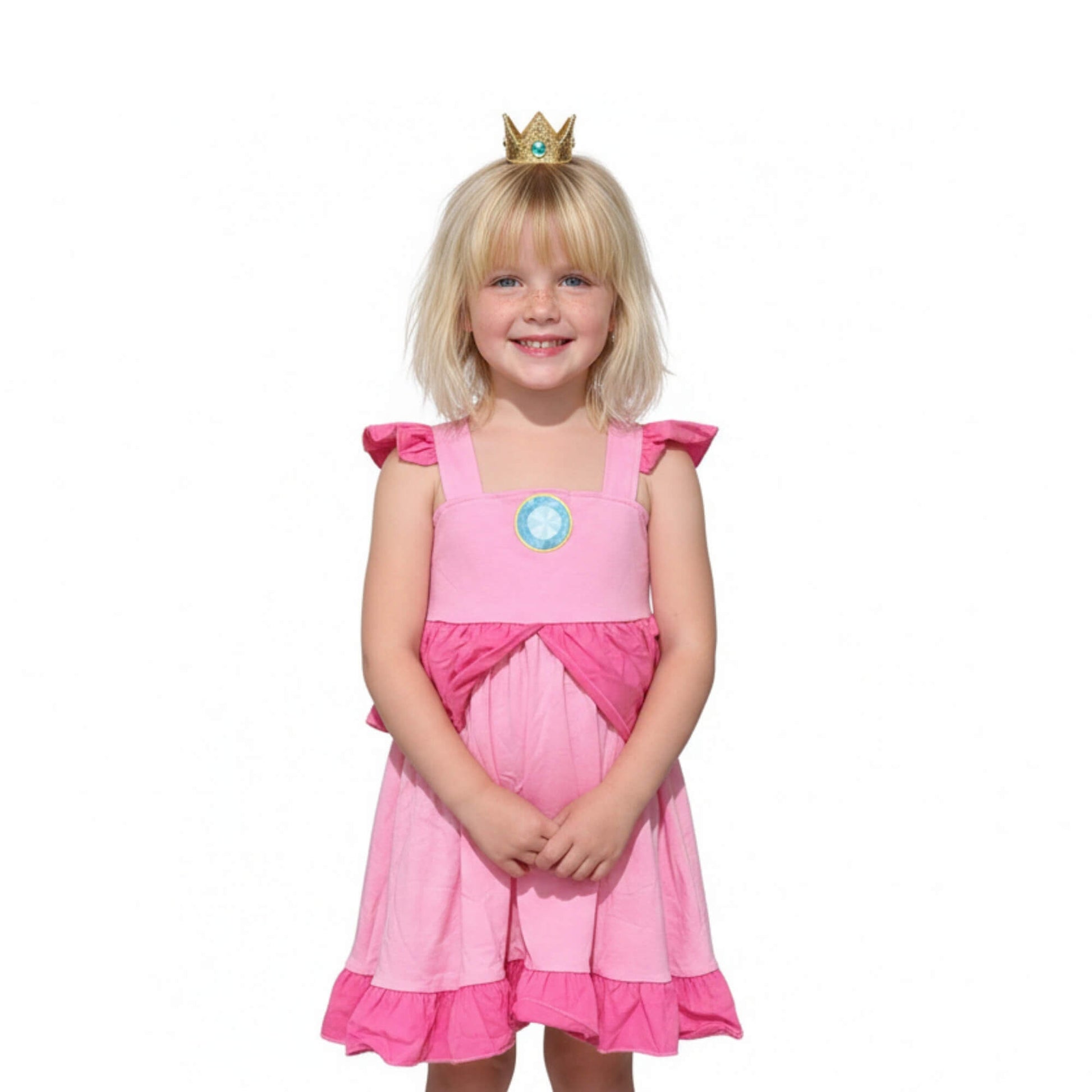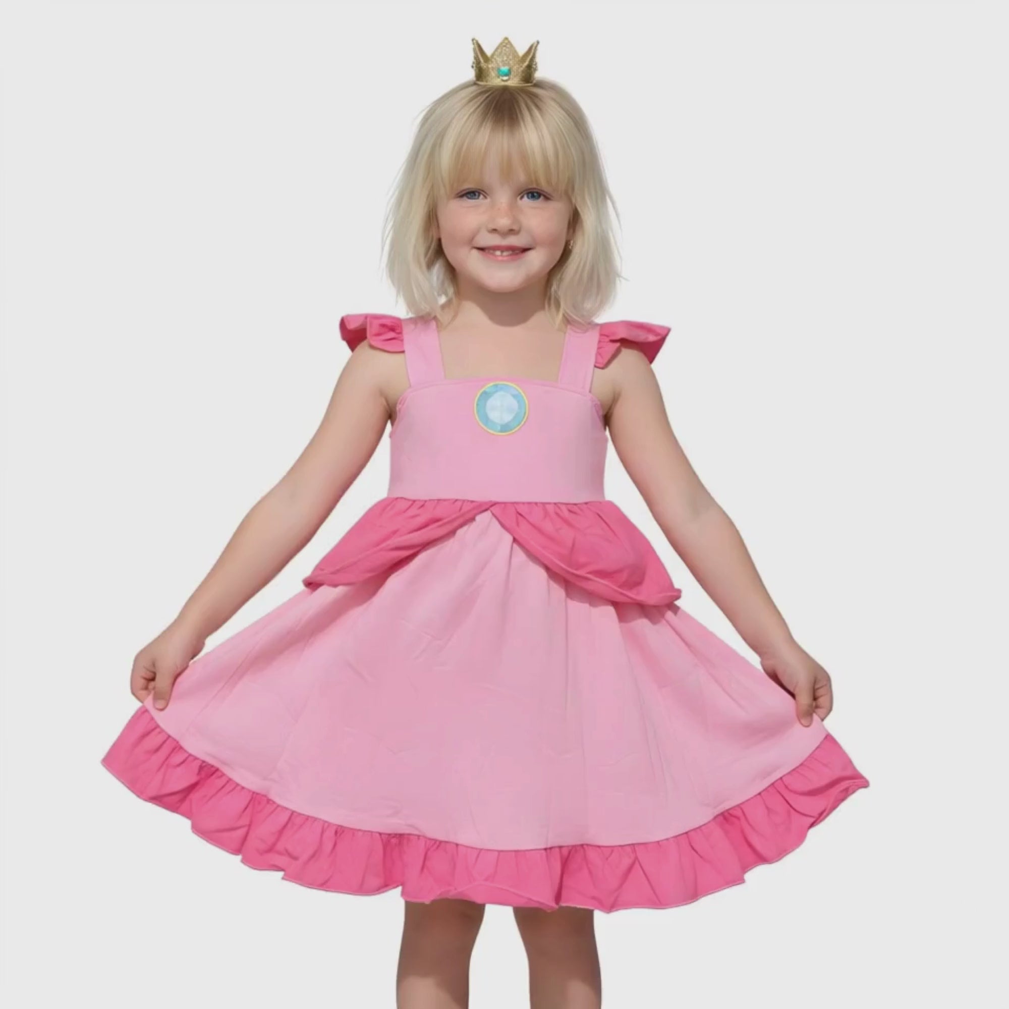 Princess Peach Dress for Girls is available for kids ages 2 to 14 years old. If your little one is kind, confident, and loves stepping into magical adventures like Princess Peach, she’ll enjoy twirling through playtime in a Peach-inspired cosplay look. This dress draws inspiration from classic fairytale gaming heroines and is not affiliated with Mario or any official brand.